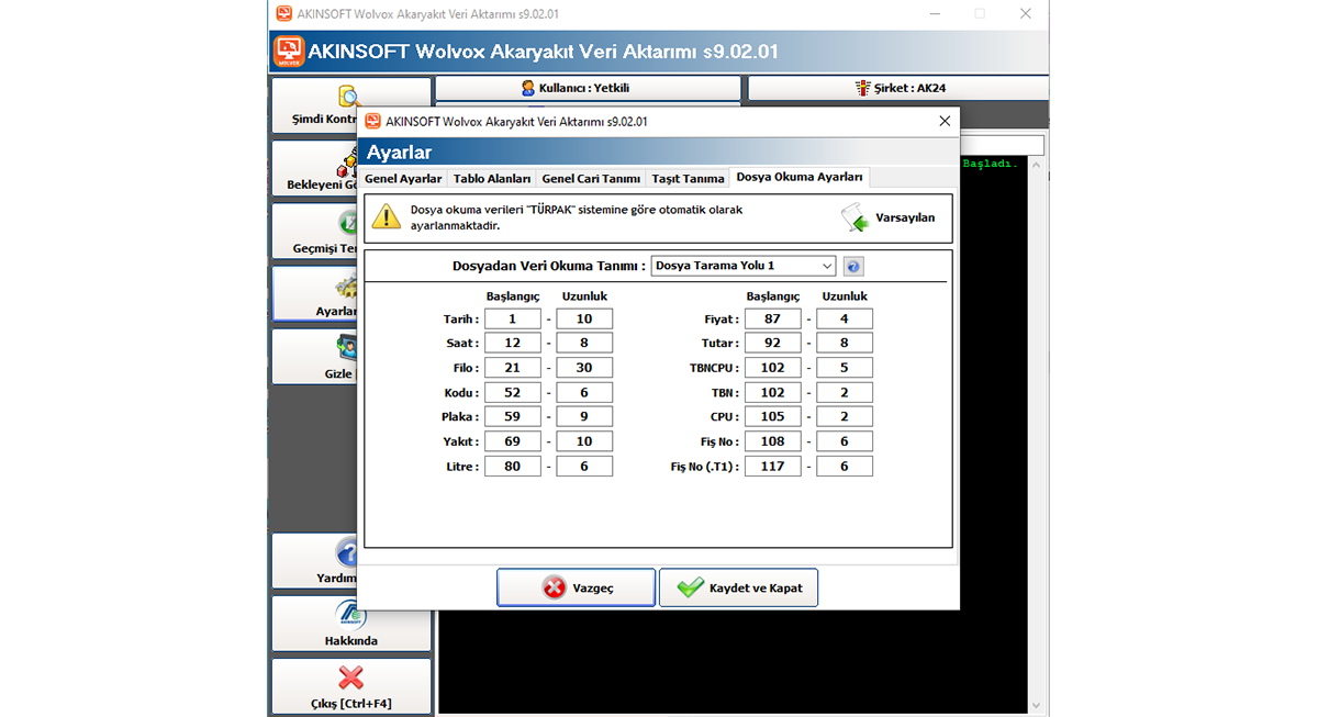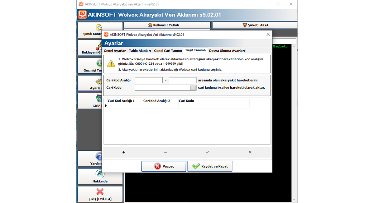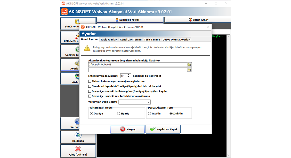 AKINSOFT WOLVOX Akaryakıt Veri Aktarımı Programı, WOLVOX ERP programı ile tam entegrasyonludur. (Cari 1, Stok 1, İrsaliye modülleri ile direk entegrasyonludur.)