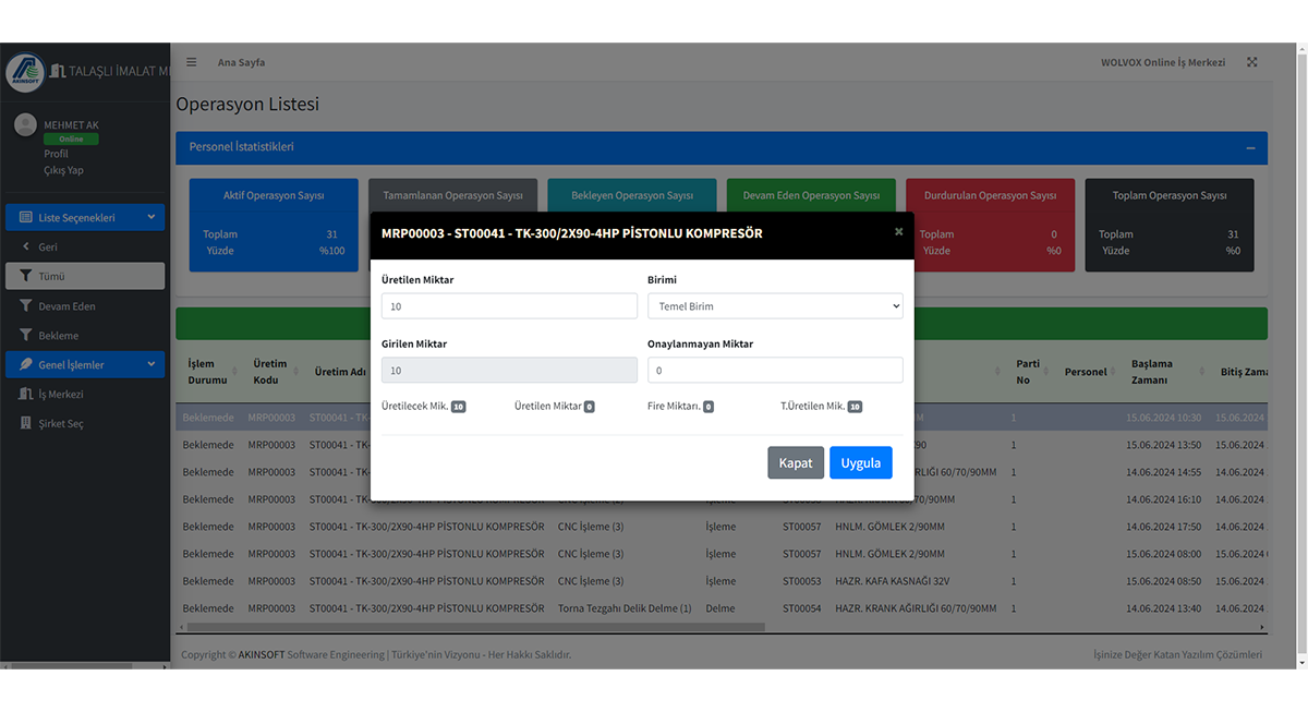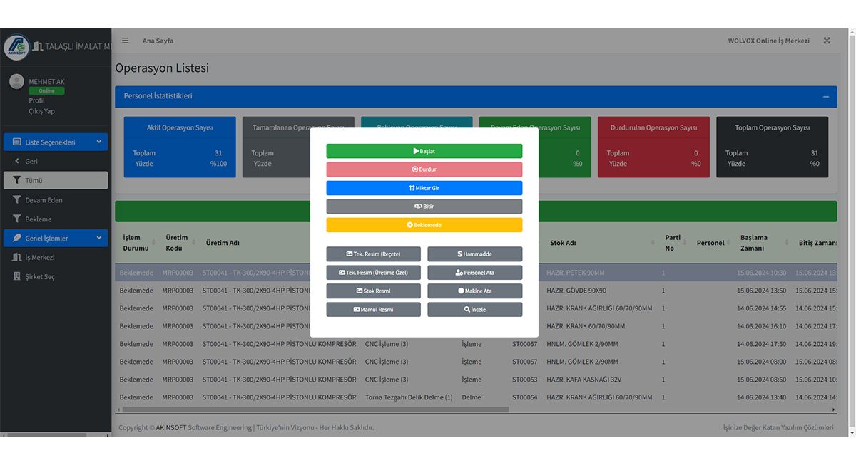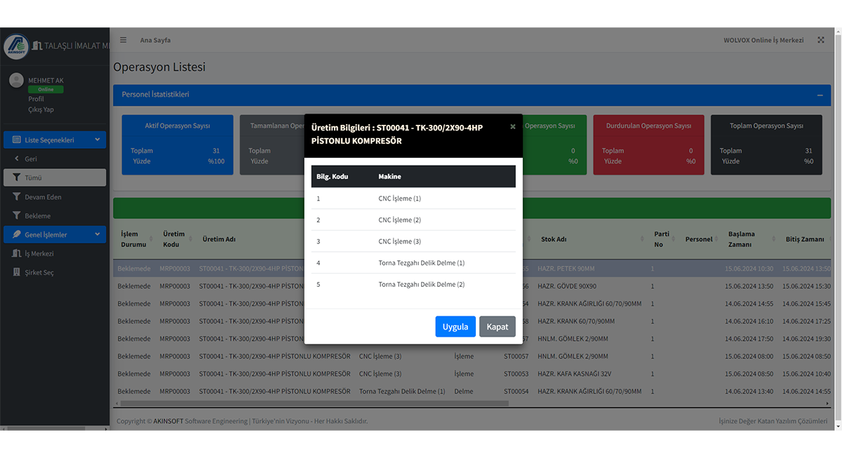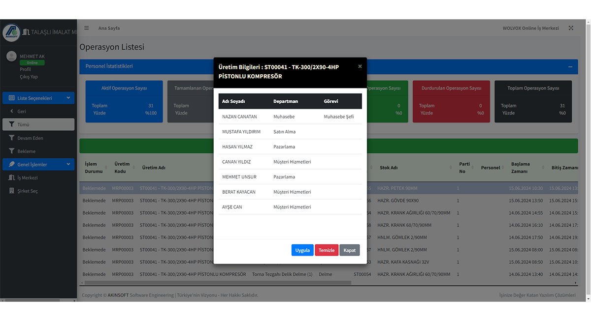 - Personel ve Makine atama ile anlık iş emirlerinde değişiklik sağlayabilirsiniz.