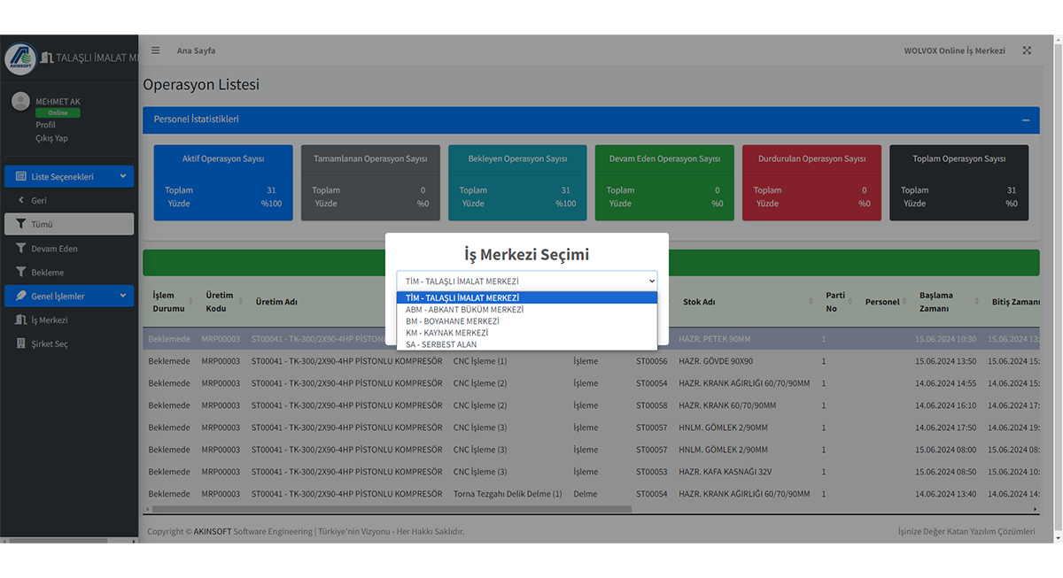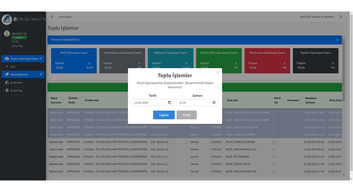 İş Emirleri, Operasyonlar, Toplu İşlemler, Makine değiştirme, Personel atama.