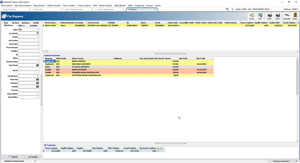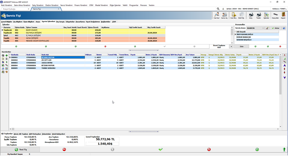 • Servis fişlerinde araç seçerek araçla ilgilenen personellerin iş yüklerini raporlayabilir, iş planını personel ve araç iş yüküne göre gerçekleştirebilir,