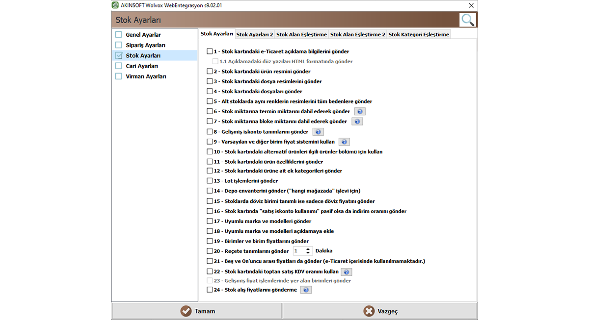 - Wolvox ERP programında tanımlı olan stok kartlarındaki birimlerden seçim sağlanarak e-Ticaret programına aktarılmasını sağlar.
